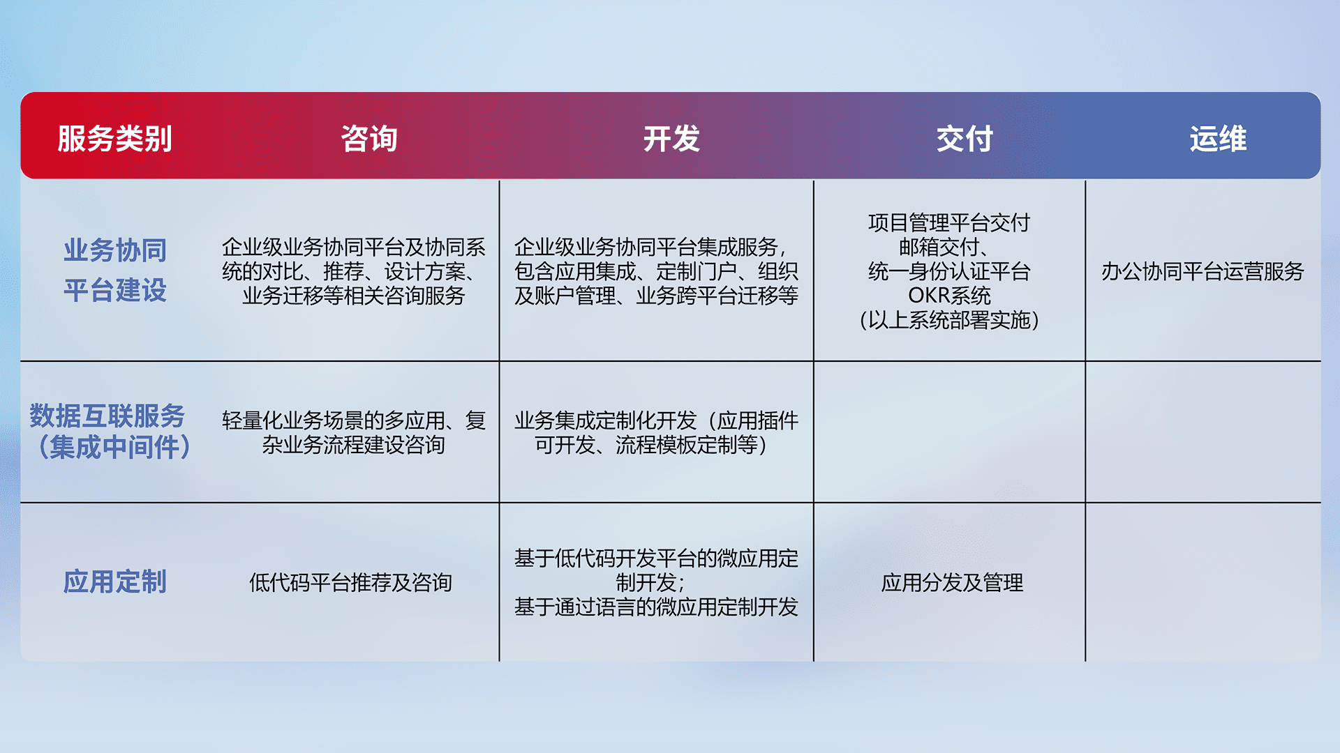 针对钉钉、、、、企微、、IDaas等平台级产品提供产品的规划、、方案、、、交付、、、、定制化开发等服务,,,,实现如统一协同办公、、、智能客户服务、、、混合会议管理、、、智能数据查询、、等业务场景,,,实现数字化转型。。。