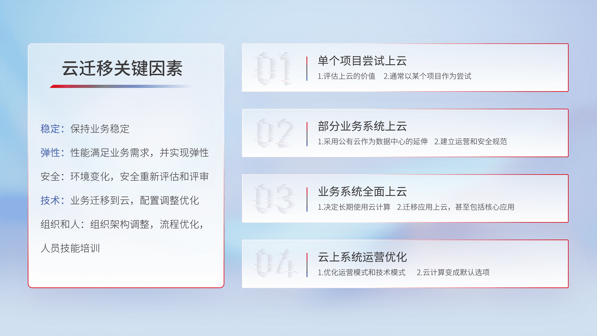 结合实际业务,,,从规划设计、、、云平台选型、、、、云原生改造、、、数据迁移、、、、集成交付,,,,迁移全过程为客户识别最佳上云路径,,,做好风险识别管理,,,,设计网络架构、、身份权限、、、、安全审计合规、、操作审计、、日志审计、、、监控告警策略、、、多站点容灾设计等,,,对云上基础设施进行整体规划,,提升IT治理水平,,以满足弹性、、、、高可用、、、高性能的需求。。